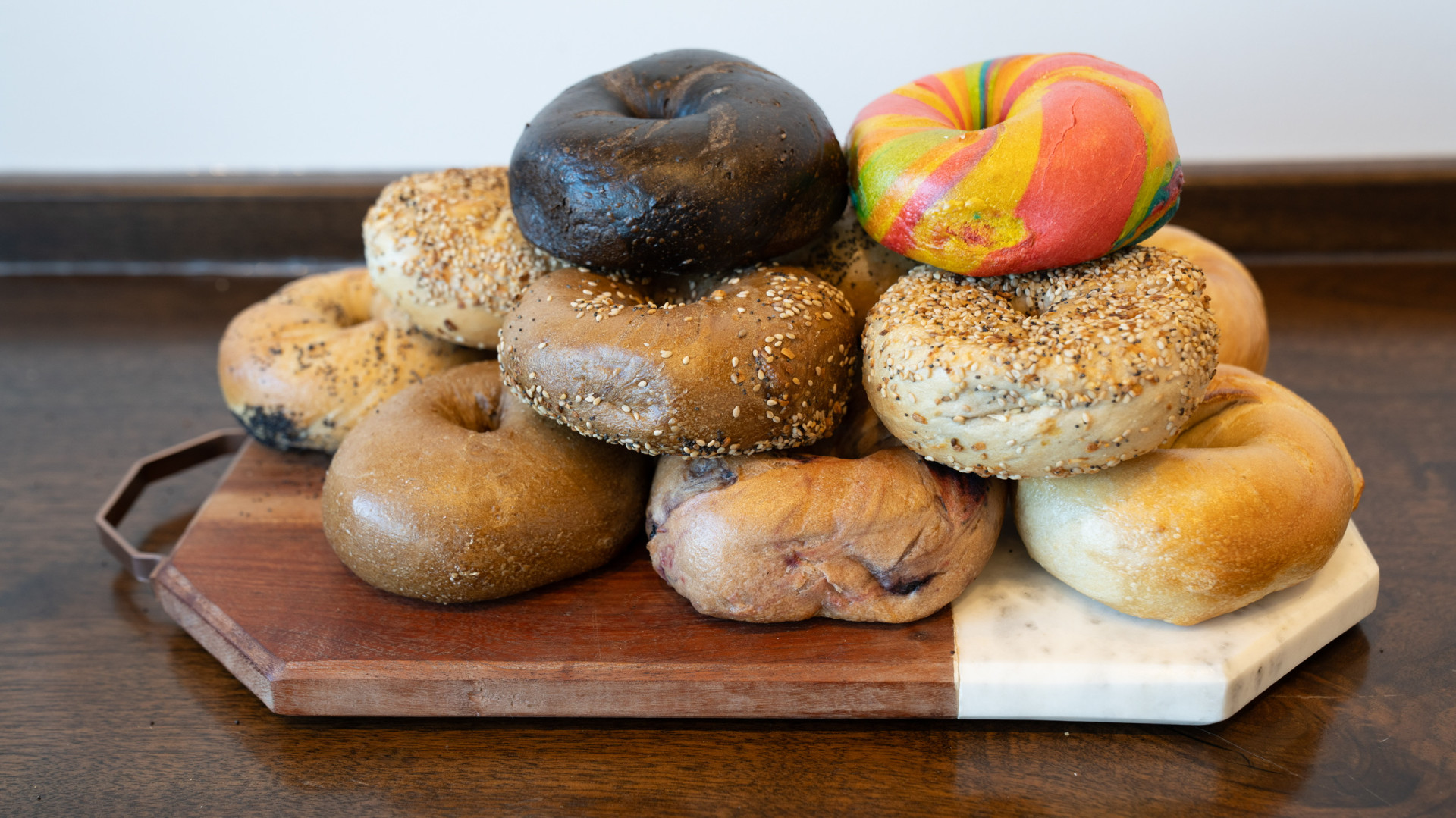 Assorted bagels (cut halves), mix of sweet & savory spreads, and assorted pastries.