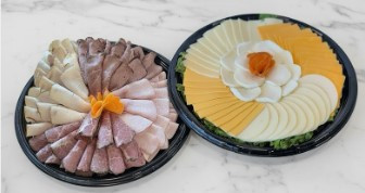 Assorted bagels, deli tray (mix of turkey, ham, pastrami and/or roast beef), cheese tray (mix of american, cheddar, swiss, provolone), pastry platter, and assorted drinks (coffee, soda, and water).