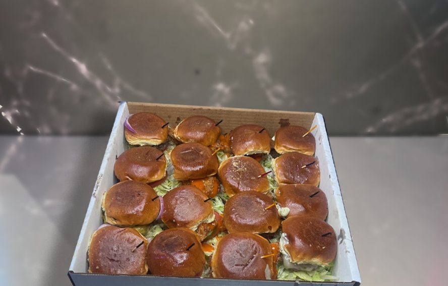 An assortment of slider lunch boxes each containing: -2 gourmet style 3oz sliders (mix of The Classic, The Western, Crispy Chicken, and Greek Falafel) Includes a side of fries, dessert of the day (either cinnamon bites or cheesecake), and bottled water.