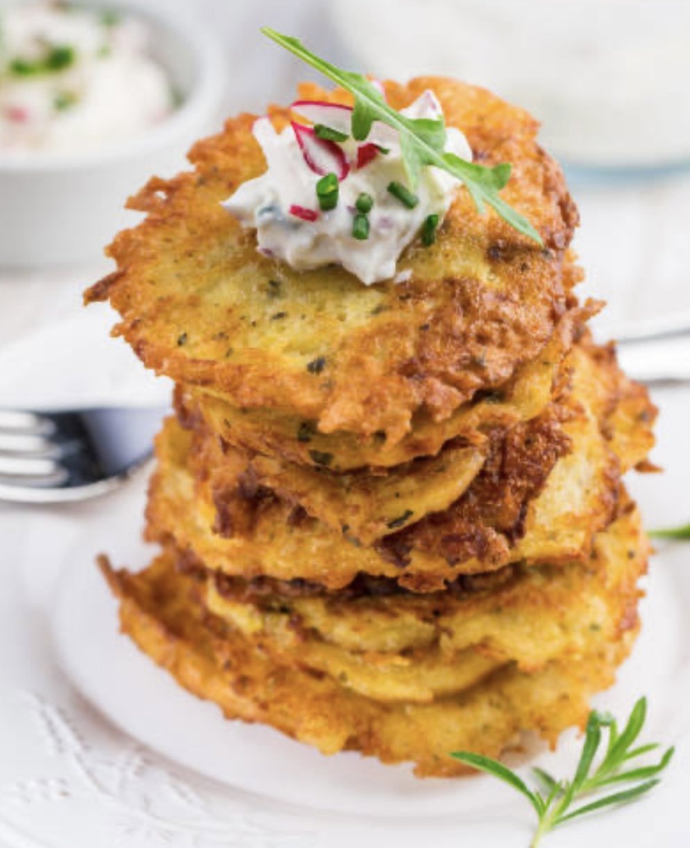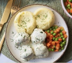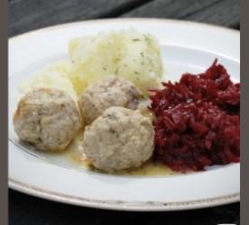 Polish meatballs made from chicken and turkey, served with dill gravy and mashed potatoes, daily selection of beet or cucumber salad, and a polish dessert or fruit salad. Water or soda.