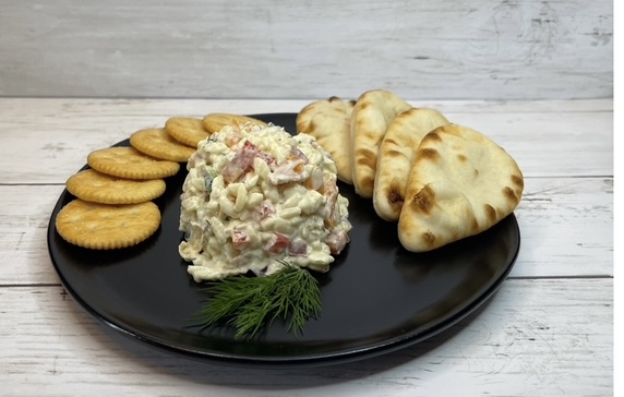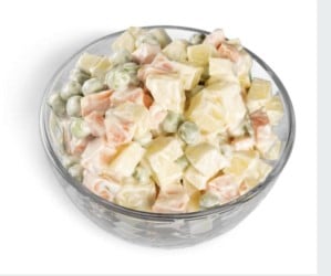 Potatoes, carrots, celery root, eggs, parsnip, peas, pickles, apples, and mayo, mustard and sour cream. Served with crackers / naan bread or mini rye bread.
