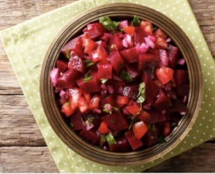 Beets, pickles, carrots, peas, red onion, dill, lemon zest, lemon juice, spices and olive oil. Served with crackers / naan bread or mini rye bread.