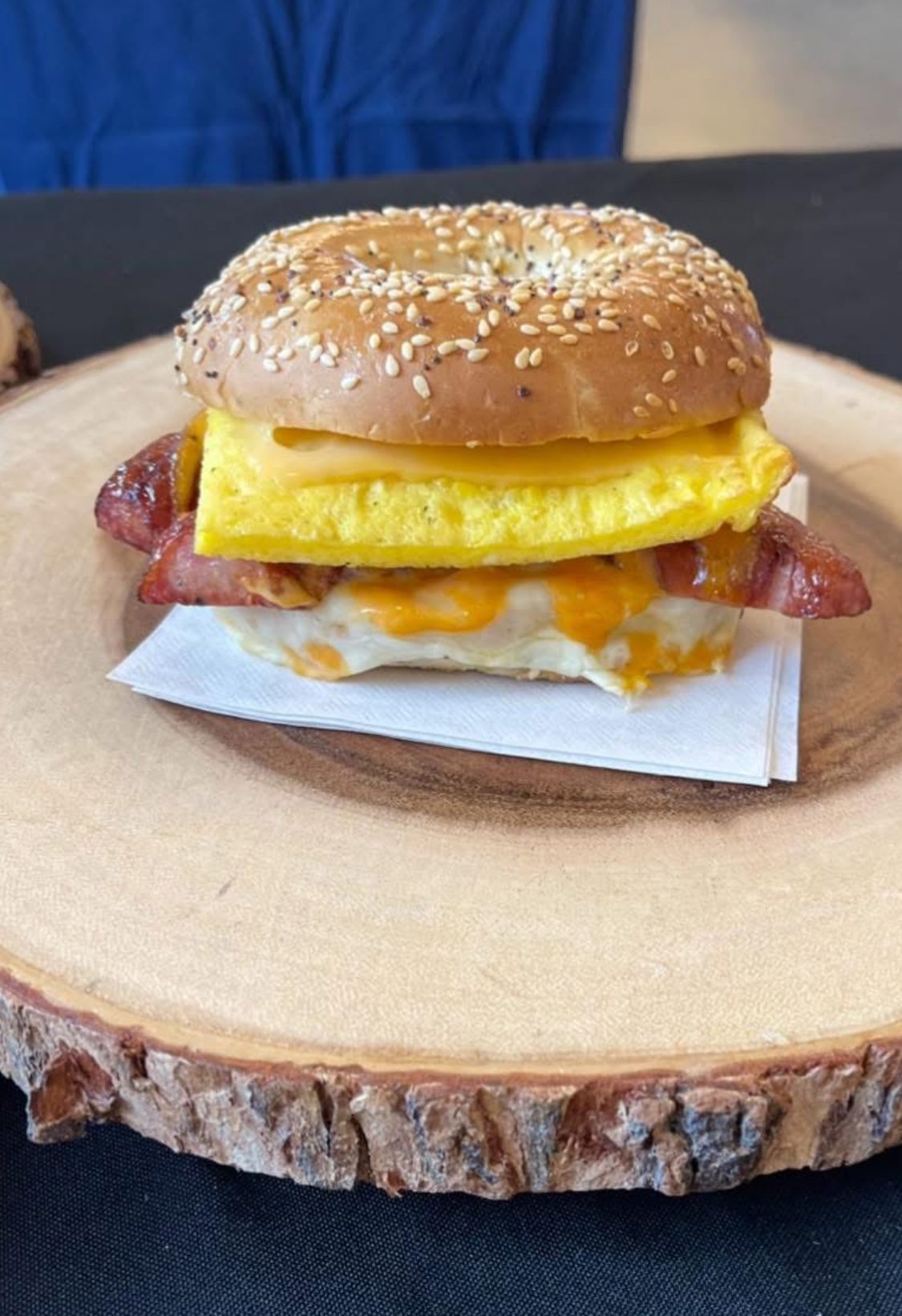 An assortment of bagel sandwiches filled with Polish sausage (some without), egg omelet, American cheese, mozzarella cheese, and house sauce. Also served with an apple or mandarin oranges and water/soda.