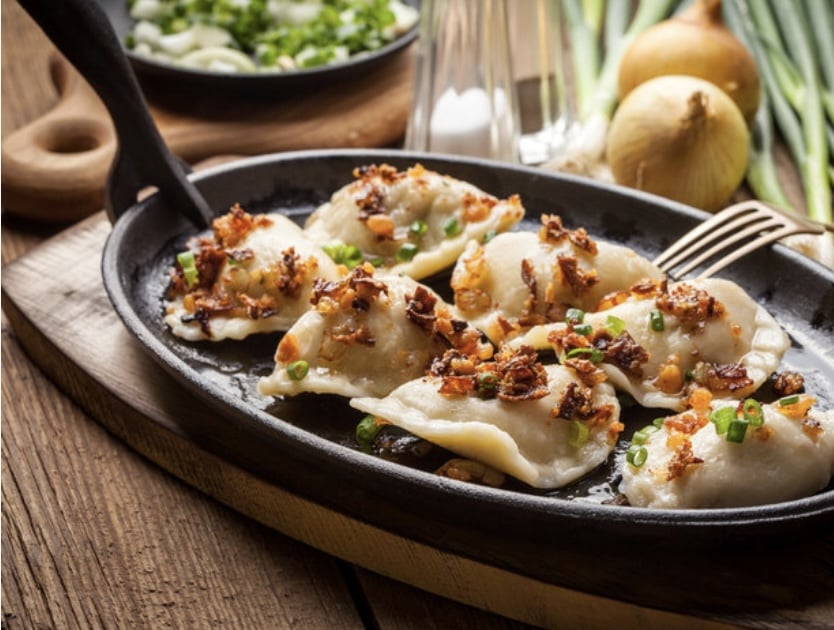 A mix of assorted pierogi boxed lunches that include 8 pierogis (potato cheddar, kraut mushroom, beef jalapeños, potato and onion, potato dill), with sour cream and fried onions on the side. Meal comes with small side salad with dressing. Water and soda.
