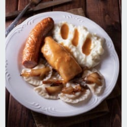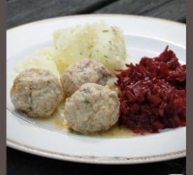 Polish meatballs made from beef and pork, served with dill gravy and mashed potatoes, daily selection of beet or cucumber salad, and a polish dessert or fruit salad. Water or soda.
