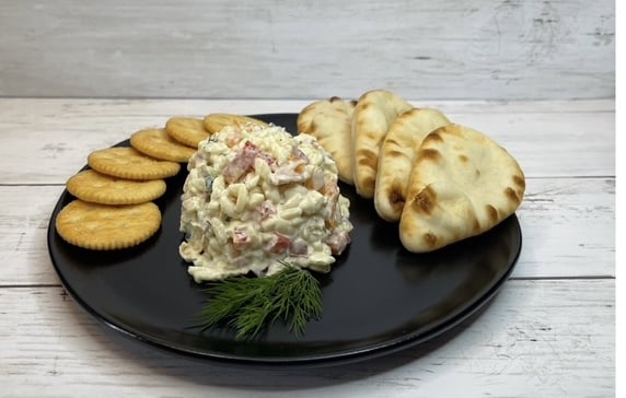 Rice-shaped pasta with ham, cheese, peppers, cucumbers, corn, red onion, dill, lemon juice and lemon zest, with mayo, mustard, sour cream and spices. Served with crackers / naan bread or mini rye bread.