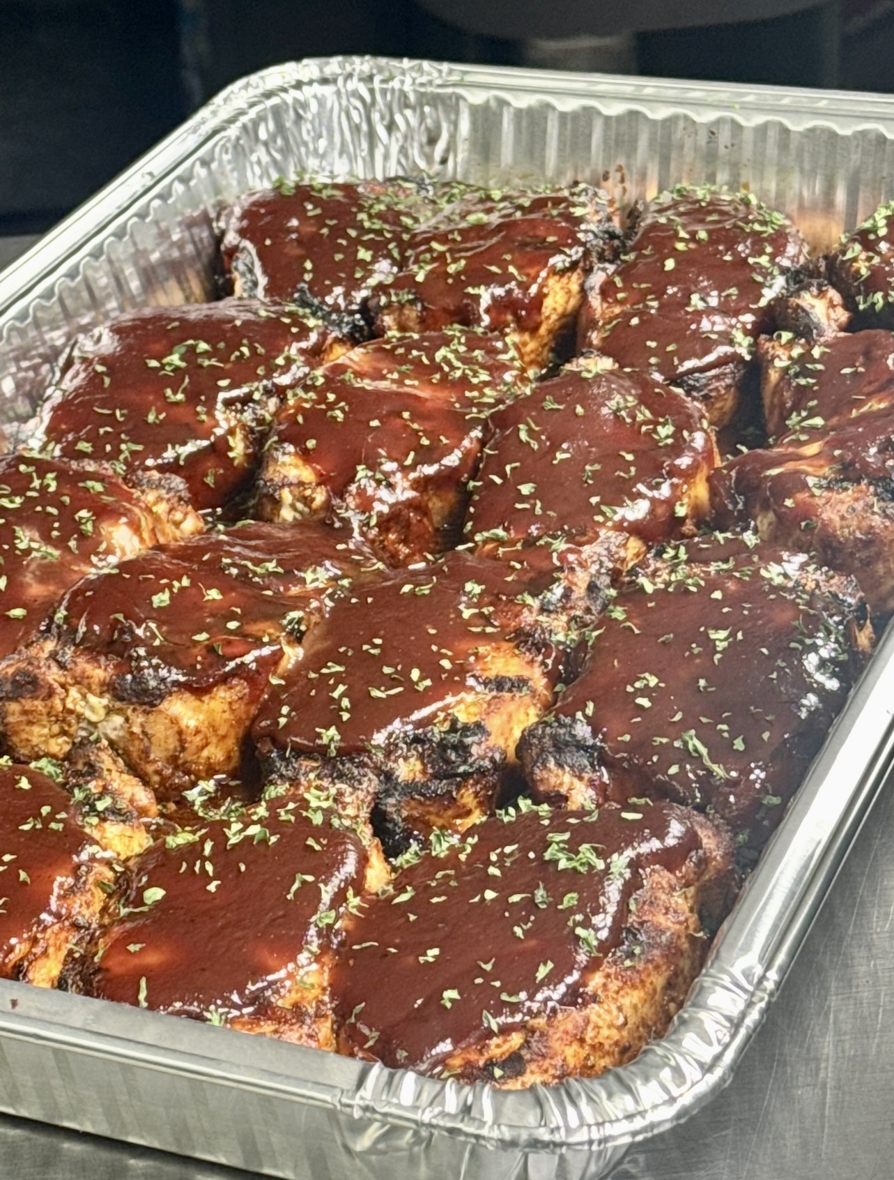 Two select daily proteins (grilled chicken, pork, BBQ or smoked beef meatloaf meatballs), side of the week, mixed greens with dressing, dessert, and water/soda.