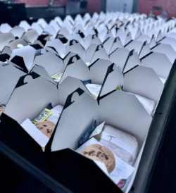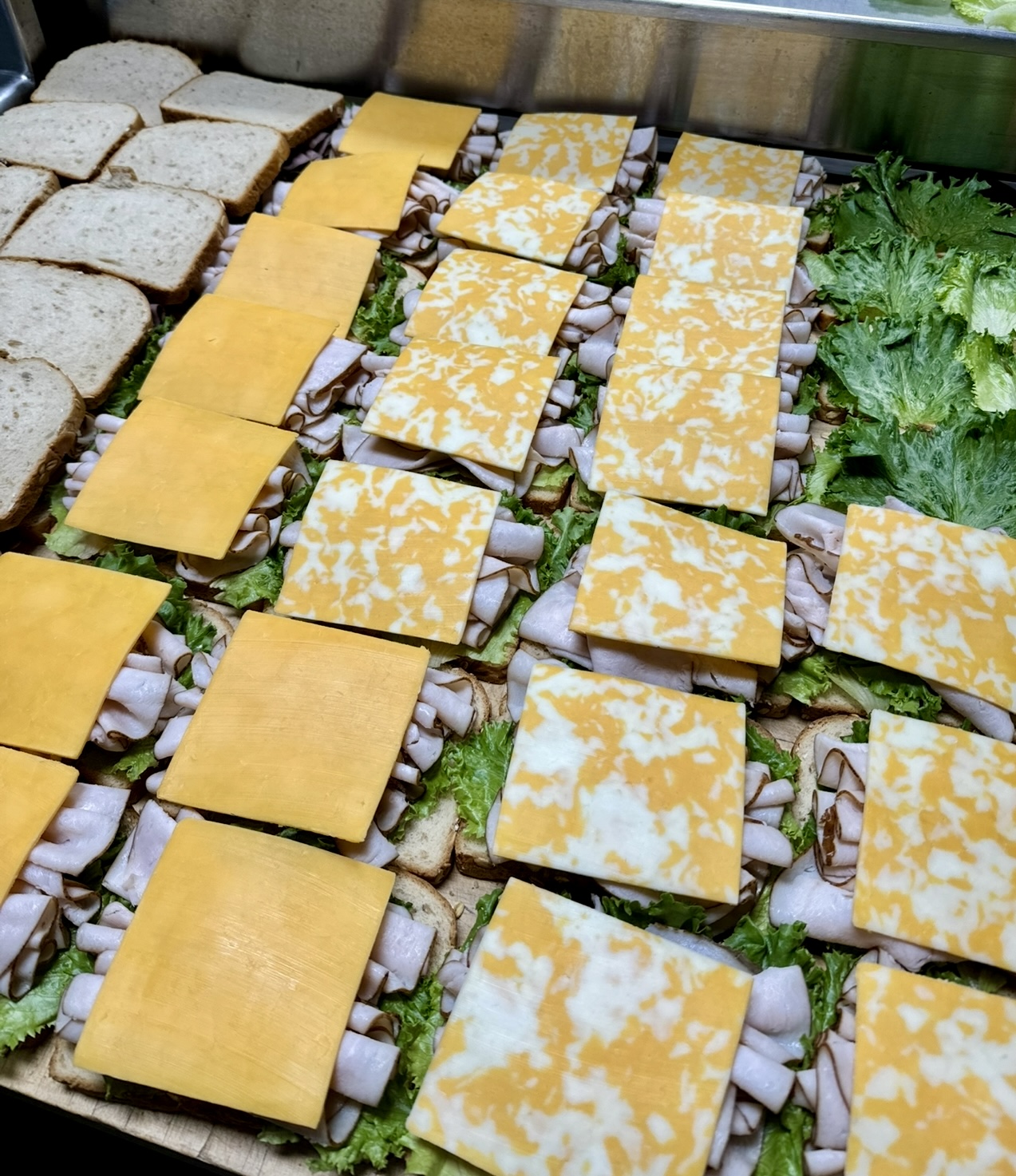 Assorted sandwiches, fruit cup, side of the week, dessert and water/soda.