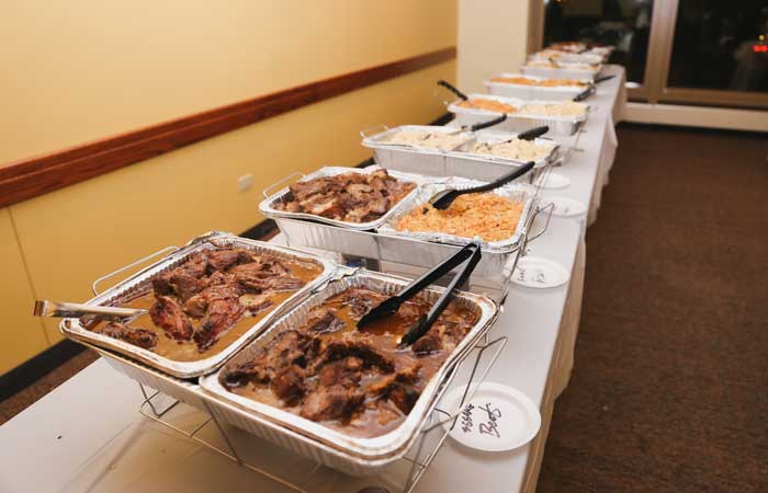 Loaded baked potatoes, all the toppings, mixed field greens with dressing, dessert and water/soda.