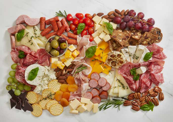 A snack box filled with unique hummus offerings and accompanying veggies and crackers, along with cheese and fruit.