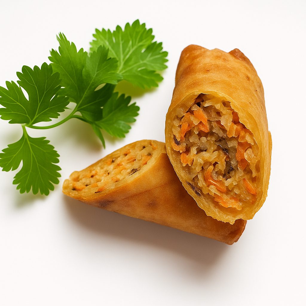 Vegetable & egg fried rice with 3 homemade specialty egg rolls and drink.