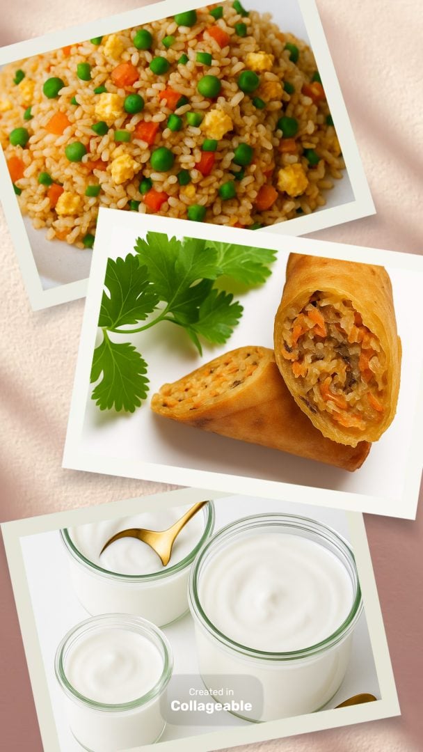 Vegetable & egg fried rice with 3 homemade specialty egg rolls, da ua (Vietnamese yogurt: velvety, creamy, sweet-tangy) and drink.